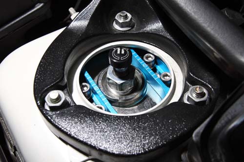 | 圖中這組魚眼上座也是西維思最近在測試的套件,透過加高上座鋁板厚度的方式,將四顆Camber調整螺絲藏在滑槽內,如此調整就不會受限於上座中央開孔的大小,且目前每天測試超過半年,依然正常毫無異音。 |