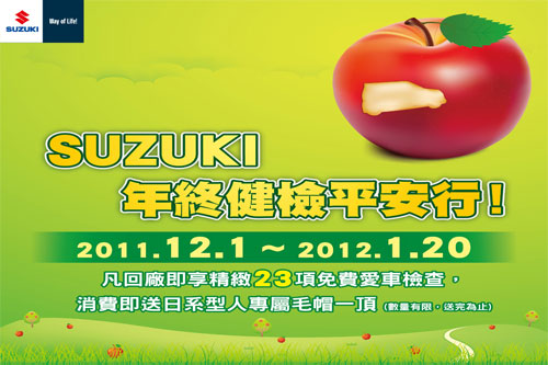 又接近歲末年終之際,為迎接新春的來臨,SUZUKI台灣總代理金鈴汽車貼心提醒各位車主朋友們,應提前為愛車做好定期且完善的車況檢查。自2011/12/1起至2012/1/20止,SUZUKI將於全省經銷商服務廠舉辦「SUZUKI年終健檢平安行活動」,邀請所有SUZUKI車主朋友們開心回娘家,除了提供多達23項周全且精緻的免費車況健診服務之外,本次為回饋廣大的車主朋友們長期的支持與愛護,SUZUKI在寒冷的冬天裡,凡於活動期間回廠檢查,消費不限金額,即送造型時尚、精美日系型人專屬毛帽一頂,數量有限,敬請各位車主把握難得的好機會!