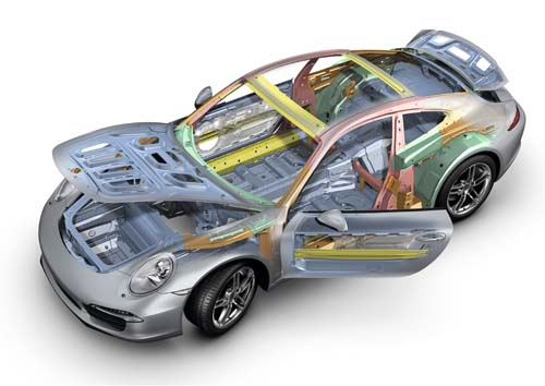 | 一直到997為止,Porsche在一般量產的911車上都是採用全鋼製車身,僅有少數高性能車款會在車身局部使用碳纖維等輕量化材料,在全新的911車上,來自VW集團的鋼鋁複合車身技術終於出現,依照車身部位不同的需求使用不同材料製作,有效降低了車身重量,新款911車身尺寸比過去更大,但重量卻反而減輕(Carrera:45公斤、Carrera S:30公斤) |