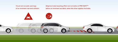 此系統不僅在時速30~250km/h範圍內自動判別前方距離過於接近的車輛,並能在時速大約70km/h時偵測前方靜止車輛或物品以同步發出警示,在系統作動時能自動判斷前方車距,並結合adaptive Brake Assist煞車輔助系統來提供更加足夠的煞車力道來預防追撞狀況的發生。而此套系統不僅能有效降低20~25%的追撞意外(原廠提供資料數據),同時也已經符合美國道路與交通安全機構NHTSA的「Forward Collision Warning」標準。