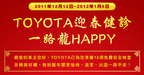 TOYOTA總代理和泰汽車,為迎接即將來臨的農曆春節假期,讓計畫開車出遊的車主享有周全的行前照顧,將於2011年12月12日至2012年1月8日舉辦「迎春健診 一路龍HAPPY」免費安全健診活動,由全台服務廠提供18項免費安全檢查,同時,回廠並消費之車主即可獲贈TOYOTA時尚購物袋。活動期間更提供TOYOTA精美禮品全面點數換購9折、現金消費8折的優惠。歡迎全台TOYOTA車主預約入廠健診,讓愛車健康加分。