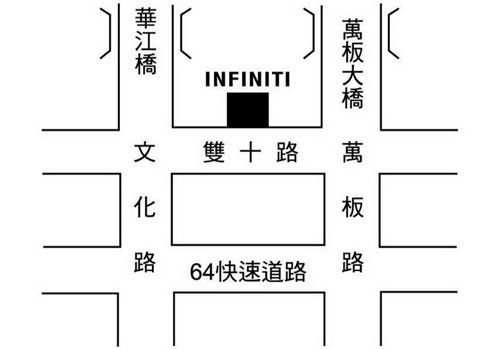 為此INFINITI特選定板橋地區建置全新專屬據點,座落於板橋區雙十路2段50號的展示中心,同時鄰近64號快速道路、華江與萬板大橋,為新北市與外縣市的聯絡要道,其交通便利的地理位置可讓顧客快速抵達。展示中心耗資近千萬元建構,佔地總面積達百餘坪,其明亮的空間氣氛帶給顧客輕鬆愉悅的賞車環境。