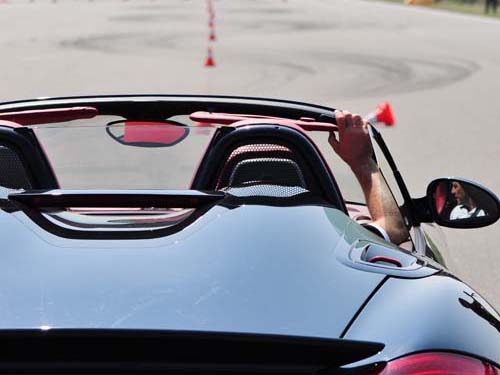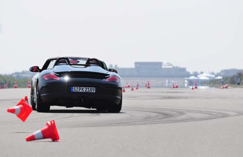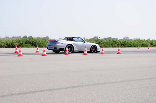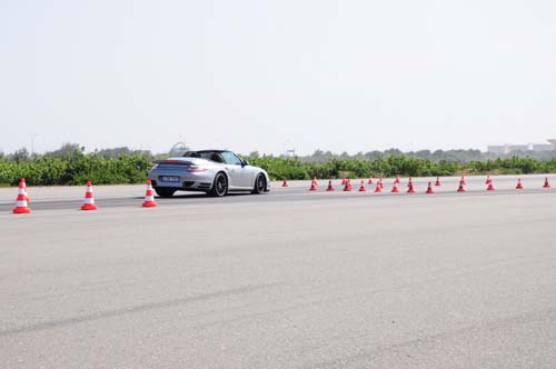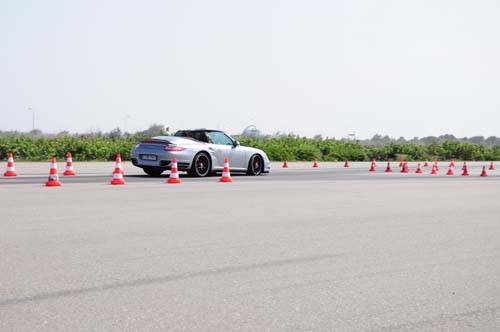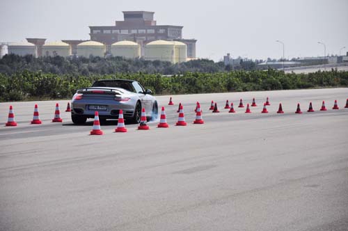 模擬車輛在緊急狀態下煞停的同時還進行閃避動作,此項目主要讓學員體驗ABS防鎖死煞車系統作動時的反應,並在教練的指引下,讓學員在承受高速煞停的強大G力下仍必須作出轉動方向盤的閃避動作,讓學員在面對緊急狀況時能夠作出正確反應以確保人身安全。不過此項目最讓人印象深刻的還是911 Turbo強大的加速貼背能力。