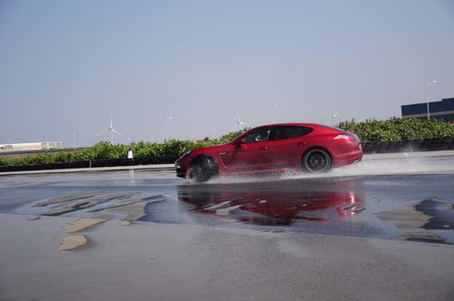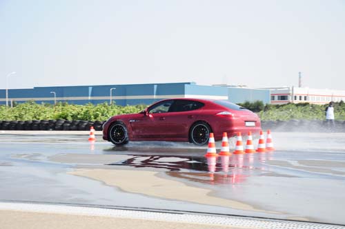 模擬濕滑路面進行快速閃避動作,將Panamera所配置的PSM動態穩定控制系統關閉,並將速度加至80km/h後進入緊急閃避車道,藉此讓駕駛者體驗車輛在原始狀態下的動態反應,接下來再透過教練的指導,進行正確的閃避動作與操作。用大尺寸的Panamera來執行這項動作,駕駛者對方向盤的控制手法需極為細膩且反應要快,只要有任何因素沒搭配好,車輛幾乎只有打轉的份,也無法回到原定的行車路線,對駕駛技巧來說是一項非常好的基礎訓練。