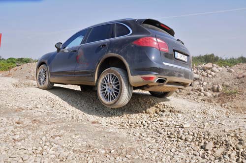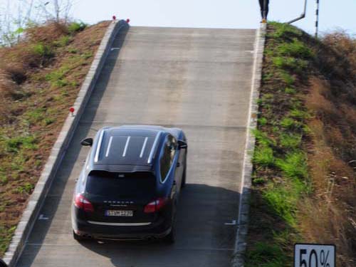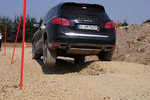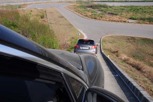 相信大多數的Cayenne車主都不會將這部高級休旅車開去越野,當然也少有機會能夠體驗面對崎嶇地形時的優異性能,而這次因為ARTC測試場充裕的設施及空間運用彈性,讓所有參與者體驗到Cayenne過人的特殊地形穿越能力。將配有PASM主動氣壓懸吊的Cayenne車身調到最高的越野設定,驅動系統也設為四驅鎖定,只要將車速控制在25km/h以下,懸吊會一直維持在最高狀態,並透過PTM循跡及PSM動態穩定系統,當車輛行駛在特殊的高落差路面時,即便後輪很容易就離開地面,但PSM系統會出面抑制車輪空轉而將動力傳至與地面接觸的另一個車輪,讓Cayenn以輕鬆姿態通過艱難地形。