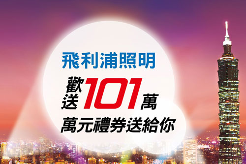 飛利浦照明迎接民國101年,特別推出「買飛利浦照明送101萬」限時優惠活動,祭出總值101萬的開運大紅包,與消費者一起歡慶民國101年!活動期間即日起至2012年2月7日止,凡於全省各大通路、家樂福、大潤發、特力屋、HOLA、好博家HomeBox、愛買與台糖量販等,購買飛利浦照明指定商品滿NT$588,即有機會獲得抽中一萬元台北101購物中心禮券,預計抽出101位幸運得主,名額有限,多買多中!