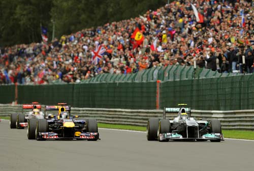 | 比利時站N.Rosberg(右)一起跑即從第5搶上第1,可惜很快就一路失守。 |
