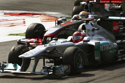 | 義大利站M.Schumacher充分展現「老人」的難纏,連壓L.Hamilton十幾圈。 |