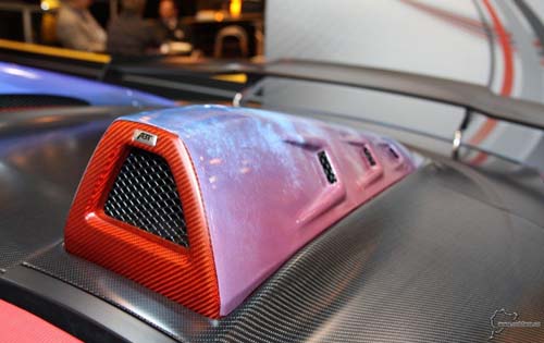| 引擎室進氣孔在延續內裝橘色碳纖維紋路裝扮後與黑色碳纖維引擎蓋,形成極為強烈的對比。 |