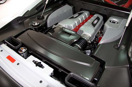 | Audi R8所搭載的5.2升V10引擎經過賽車部細部重新調整後,原先最大輸出525hp/54kgm藉由重新調整引擎輸出達560hp/55kgm。 |