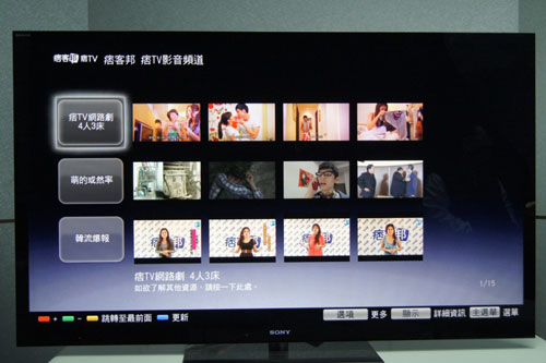 Sony獨家提供的BRAVIA Internet Video網路影音平台越來越豐富的影音內容。除了目前點閱排行榜前三名,包括主打熱門院線片電影預告的CatchPlay、提供完整熱門戲劇和全長電影的hichannel、以及每月線上自動更新熱門歌曲的美華卡拉OK,1月18日起更新增痞客邦痞TV頻道以及StreetVoice街聲頻道。