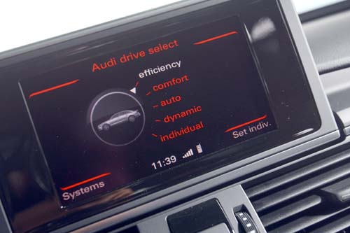 試駕的這部A6裝有Audi Drive Select可程式車身動態系統,此一系統連動引擎、變速箱與懸吊系統,系統內建包括Efficiency、Comfort、Auto、Dynamic與Individual五種不同的模式,Individual模式可隨著駕駛人的喜好隨意設定各種參數,Auto模式則會隨著駕駛方式不同自動調節;當然,在Dynamic模式下擁有最佳的運動與反應,不過我們這次試駕時,刻意以較長的時間試用Efficiency模式,我們想知道的是Efficiency模式會不會讓車輛變得無趣難耐?在Efficiency模式下,引擎與變速箱會以較經濟的方式運作,不過由於3.0 TDI的強大動力本質,即使是經濟模式的動力輸出,也不會讓人覺得有所不足;Dynamic模式下的強大輸出,則豪強得讓人大呼過癮。