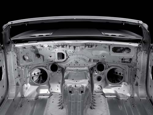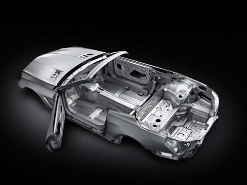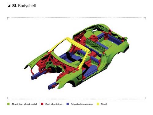 第6代SL-Class最引人注目的重要特色之一,相信即是首度採用的鋁合金車身平台設計,此具大部分皆採用輕量化鋁合金材質(高達89%)所打造而成的車身平台,不僅能提供較第5代車身平台降低達110kg的重量,第6代SL350更因而擁有較5代車型降低達140kg的輕量化車重效益,同時也更加符合其「SL-Sport Lightweight」的原始英文字義。此具鋁合金車身平台的後段不僅結合更加輕量的鎂金屬材質,同時更在A柱部位整合高強度的鋼鐵管狀結構,提供兼具輕量化與高剛性的雙重優勢。