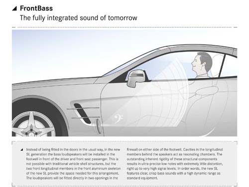 為了因應開篷時的聆聽音樂需求,第6代SL-Class還搭載另一項創新技術,也就是原廠命名為FrontBass音響系統。利用設置在引擎防火牆雙前座腳部位置的縱置低音揚聲器設計(直徑達217mm),不僅將可有效降低傳統設置在車門低音揚聲器所較常出現的震動,同時也能將車門揚聲器換裝為中音或是高音配置,提供更多的車門置物空間設計。另外,第6代SL-Class不僅能選配更加高級的Harman Kardon Logic 7與Bang & Olufsen等高級品牌音響系統,車室乘員也能在行車時盡情體驗真實的音樂聆聽享受。郭慶裕