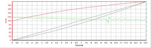 | 平穩順切的加速駕馭,讓成績平順地作出,但在9秒7左右的上下震盪G值似乎有點怪異! |