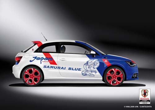 | 不僅A1 Sportback,Audi 還在本屆東京車展發表特殊版本A1 Samurai Blue。此車靈感來自日本國家女子足球代表隊(Samurai Blue藍武士隊)贏得2011年女子世界盃冠軍,車身採用日本國家足球代表隊的藍白雙色,再加上日本國旗的紅色塗裝與隊名字樣。這款藍武士A1 Sportback搭載122bhp的1.4 TFSI汽油引擎,是一款道道地地的小鋼炮,完全切合女子足球員的剽悍風格 |