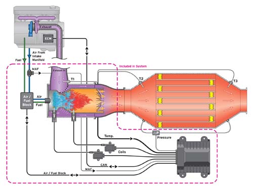 | 此為DPF主動再生過程的示意圖,原廠電腦會偵測DPF前後管路內的壓力差,判斷DPF的阻塞狀況,若組塞情況嚴重便會增加噴油量,讓未經燃燒的柴油形成蒸發油氣,跟隨廢氣流入集塵器中再進行燃燒,用以提高DPF的溫度達650度以上,進而將附著其上的碳微粒轉化為二氧化碳,排放於大氣中。 |