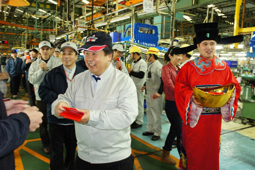 春節假期結束,中華汽車選在今日(大年初九)開工,開工首日總經理劉興臺上任首年特地帶領新團隊於廠內繞場團拜,為了迎春納福接財神,除了請廠內同仁扮演財神爺跳加官象徵中華好運旺旺來之外,總經理劉興臺也親自發放2000個開工紅包,祝福所有同仁財源廣進龍年荷包滿滿。劉總所到之處無不受到同仁員工的熱烈歡迎,更有同仁以「龍吟虎嘯 車型狂銷六萬台」、「龍騰虎躍 獲利年年創新高」等新春對聯為公司立下"超級目標",新團隊們看到後直呼壓力好大,總經理則期許大家今年繼續努力再創佳績,明年保証發大紅包。