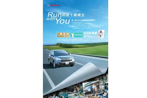 為了迎接第十萬車主的到來,Honda Taiwan即日起展開「Run With You迎接十萬個車主」系列活動。即日起至12月底止,推出酷透卡抽獎活動,凡是Honda車主,或在活動期間至Honda Cars賞車並試乘的消費者,都可獲得一張酷透卡,透過酷透卡於Honda Taiwan官方網站取得密碼認證並登錄成功者,即可參加幸運抽獎活動,有機會獲得香港半島酒店雙人遊等大獎。