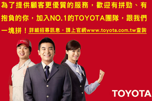 另外,TOYOTA全國人力招募即日起實施。招募職缺包括服務專員、技術人員及行政職人員等,歡迎對汽車產業有興趣且具有熱忱的夥伴一同加入TOYOTA團隊。詳情可洽TOYOTA官網人力招募http://www.toyota.com.tw/event/201101_wanted/。