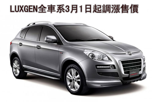 因應全球原物料成本上揚、匯率波動影響所造成各種車材成本上升,LUXGEN旗下全車系車款將於3月1日起調整售價,其中LUXGEN7 MPV及LUXGEN7 SUV各車型全面調漲1萬元,LUXGEN7 CEO則從原本165萬元調整為168萬元。本次漲價肇因於LUXGEN有部分零件來自日本,如日本Aisin精機所製造的變速箱、日本新日鐵所生產的高鋼性鋼材等,而日圓長期強勢升值對於車廠而言實為嚴重負擔;此外,LUXGEN配備之前瞻科技,其材料來源以全球飆漲的貴金屬原料為主,如鈀、銠等,造車成本相對大幅增加,亦是售價調整的另一項主因。