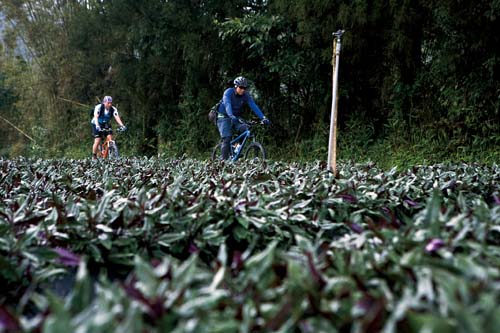 繞行雙連埤一周飽覽清幽的山光水色之後,若想來點刺激的,就應該挑戰越嶺的Off road路線。由雙連埤往山下的方向下滑一小段距離,右手邊即可發現一條往山中深入的岔路。循此叉路右轉而上之後一開始的路況便極差,不但坡度陡峭而且遍地石塊,幾乎無法騎乘,路面左邊為農地,右邊山坡為造林地,路幅不大,僅容小型車輛單向通行。由於地面溼滑,這樣的爬坡路況即使變速檔位置於最輕齒也是幾乎無法騎乘,後輪極易打滑。下車推車前進其實也不會比較慢。這樣上坡的路段並不長,就這樣邊騎邊推車的辛苦前進,不知通過幾個彎道之後,不久便可抵達最高點。