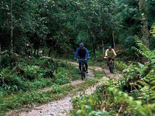 此時路邊二側已是密林,路面則由堅硬的土石路面轉為泥濘、土石交錯路況,有些路段甚至還有積水,身上的衣物和車身都沾滿了泥水。由於路面溼滑,這樣的下坡要控制車速似乎也不太容易,部份路段石塊、樹根交錯,後輪必須降低胎壓提昇抓地力。儘管如此,彈跳仍然劇烈而且很難避免滑倒的命運,但也正因如此,更增加了刺激感與樂趣。即使加上玩賞的時間,不到三個小時就已下到平地的產業道路,在進入產業道路之前的最後二百公尺幾乎都是沿著溪流而下,水流也會流經林道的地面,對大多數人而言都是很新奇的騎乘體驗。接上平地的產業道路後,沿著溪邊的道路可銜接台七線省道,能一路回到原來的停車處,由台9甲線公路上雙連埤,再經由越嶺林道抵達台7線再回到起點,這樣的一條環形路線Off road路況的下坡的距離遠多於上坡,而且在這條林道的末端還能將沾滿泥巴的車身清洗乾淨,真是一條很難得的優質登山車騎乘路線。
