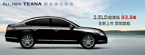 NISSAN ALL NEW TEANA自2009年上市以來,獲得13,000多位菁英車主一致肯定,創造口碑佳話,於大型豪華房車中締造不同凡響的地位。裕隆日產汽車自即日起同時推出NISSAN ALL NEW TEANA 2.0 TA旗艦版及2.5 LD經典版,2.0 TA旗艦版售價新台幣91.5萬元,新增HID頭燈;2.5 LD經典版超值售價新台幣93.9萬元,搭配分期零利率及業界最長「6615」延長保固專案,增加多元級距,讓車主輕鬆入主,享受無與倫比的舒適駕乘感受。