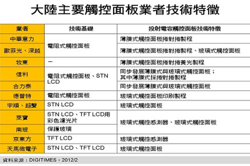 隨著大陸品牌智慧型手機市場興起,大陸投射電容觸控面板廠在2011年進行的積極投資獲得極有力的出海口。DIGITIMES Research分析師楊仁杰分析,其中,韓廠三星電子(Samsung Electronics)也積極推出中低階智慧型手機產品,向新興市場促銷,目前已有多家大陸觸控面板廠取得智慧型手機用觸控面板訂單。由於客戶價格敏感度高,到2012年初為止,大陸觸控面板業者所採技術仍以薄膜式投射電容觸控面板為主。