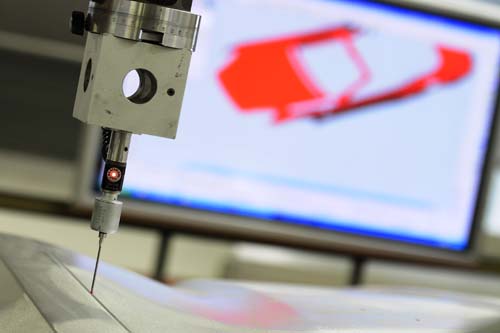 | 電腦控制的探針會偵測全車每一個部位的方位與尺寸是否達到標準,藉此作為生產線組裝設備的誤差調整依據。 |