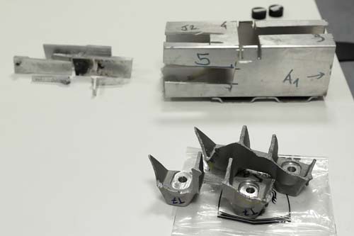 | 此為研發中的鋁合金車架原型,在焊接過程中容易因高溫而產生位移,因此需先以夾具固定。 |