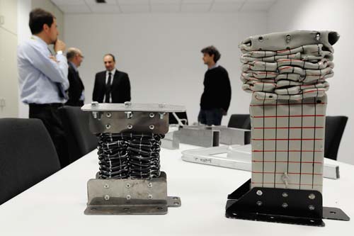 | 此為Ferrari最新的鋁合金研發成果,右邊管狀架構為最新的金屬黏著劑技術,左上方則為鋁顆粒成型的輕量化架構。 |