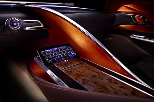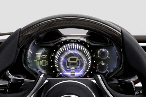 此外,LF-LC更擁有許多相當酷炫的高科技配備,除了具備兩組12.3吋的大尺寸LCD螢幕用來顯示行車與導航系統等各項資訊外,更可藉由另一個猶如iPad般的觸控式面板來進行操作與控制;此外,除了位於控檯上的觸控螢幕外,在每個車門把處下方皆設計有獨立的觸控式面板,可用來操控車窗、座位、個人娛樂系統以及車外後視鏡角度等調整動作。另外,在車艙內最炫目的設計就是採三層式類比顯示技術設計的LCD液晶儀錶,為駕駛者帶來十足立體的視覺感受,並讓車艙充滿強烈的科技氛圍;而此多層式立體儀錶,最底層是Eco量錶的背景,可顯示溫度與燃油量等資訊,中間層則是轉速錶的內圈,最上層則可顯示轉速錶、速度錶以及Eco計量錶等各項指標。