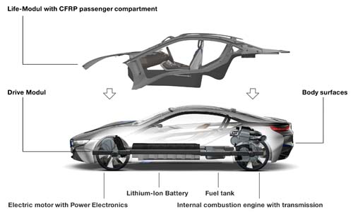 | 車身外殼採用碳纖塑料量產技術,車架主結構則是鋁合金材質,造就出i8 Concept僅1480kg的車身總重。 |