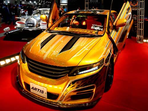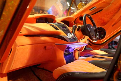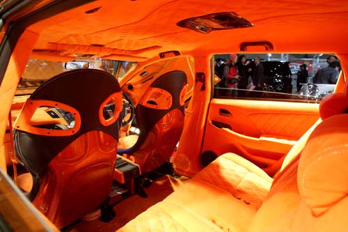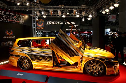 耀眼的金蔥烤漆配上鍘刀式車門與21吋大腳輪圈,這輛由澳洲House of Kolor專門針對外觀塗裝創意設計所打造的Honda Odyssey,其吸睛程度絕對是今年全場重點車款之一,在金黃底漆的襯托之下不僅將極為複雜而「惹火」的彩繪車身形成強烈視覺對比,就連車內B柱也都採用相同手法。而原本的暗色系內裝風格就連頂蓬也完全改為亮橘色系,在橘色中控檯麂皮與菱格紋路的鋪陳下,營造出奢華而溫暖的車室質感。