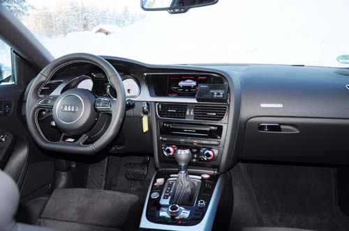 S5 Sportback的內裝同樣經過小幅度的調整,雖然整體的儀錶板與中控檯設計維持與先前相同的架構,主要的變更集中在MMI旋鈕周邊以及新增的平底式跑車方向盤,全新的方向盤當然具備多功能控制按鈕以及換檔撥片,而一如其他的S/RS車系,換檔撥片採用鋁合金製作。
