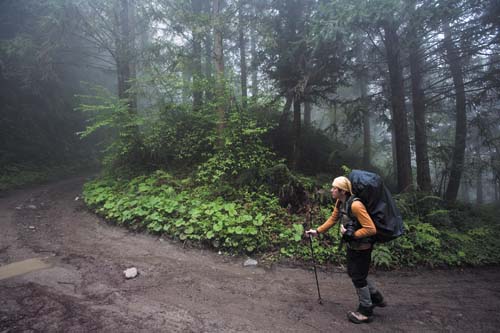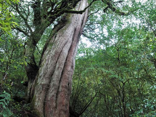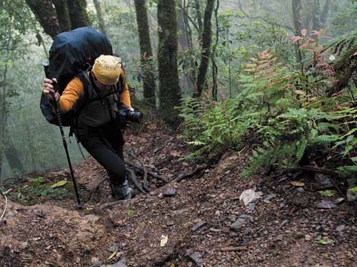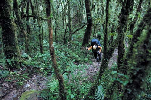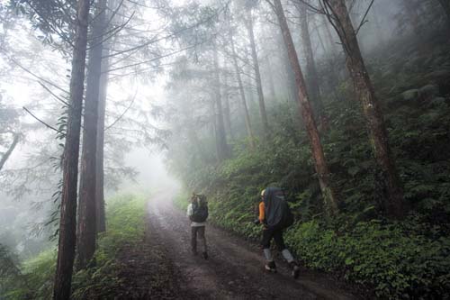通往仙境的路途當然不會輕鬆,由林道旁的登山口開始就是一路陡上,且地面溼滑難行,尤其下過雨之後更是如此,因此沿途多處留有前人留下的繩索可供使用,雖然不好走,但路跡非常明顯,每逢岔路幾乎都有各登山團體留下的明顯布標,而且數量極多幾乎可稱之為氾濫。我覺得太多了一些,有些布條甚至以塑膠製造,遠遠看去有些像是五顏六色的垃圾,除此以外,沿途的森林景觀的確非常原始茂盛,滿山片野不乏造型奇特;粗大高聳的神木級巨木,由於此地經常霧氣濃重,所以走在林中感覺氣氛相當清新淒美。這一帶山區的步道會穿越早期殘留的林道,以及直上的步道交錯前進,雖然部份路段陡峭難行,但距離都不長,接上廢棄的林道後就可以喘口氣的再走一小段,然後又再度上切山腰,大約四、五回之後就可以抵達最高點,緊接著就脫離森林進入高山草原的範圍,坡度就和緩許多了。從登山口開始直到森林與草原界限的最高處,大約攀昇高度為七百公尺左右,這段距離雖不長,但坡陡難行而且值得停下賞玩或拍攝的自然景觀相當豐富,所以我們走了大半天才進入草原區。
