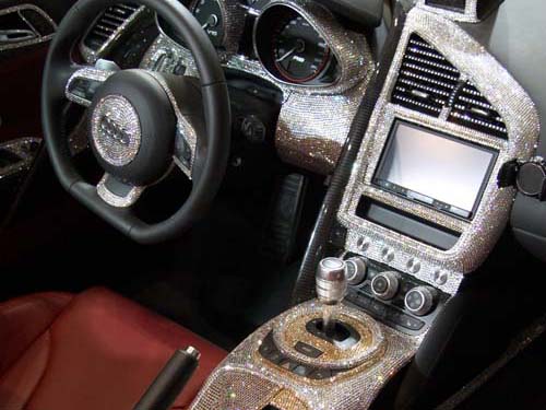 | Zees奢華VIP風/Audi R8 Spyder雖然夠引人矚目,若能配上奢華的水?肯定羨煞不少女性,由Zees所設計的R8 Spyder不僅A柱舖滿閃亮亮的水?,就連中控台也是強調的重點區域。 |