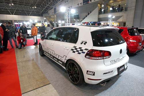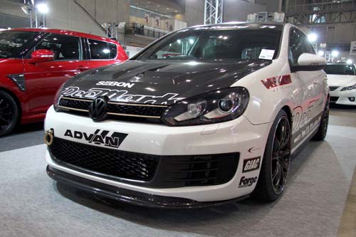 | Golf重砲前來助陣 在全世界相當受歡迎的Golf GTI當然不能缺席日本改裝盛會,採用碳纖維空力外觀的改裝手法雖然不及日系重炮,但這也已經是相當難見的Tuning式樣。 |