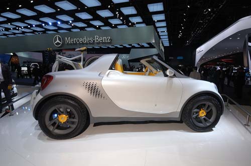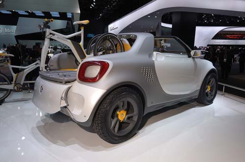 這次車展Smart再次展出了讓我們眼睛為之一亮的全新概念車,這部名為Smart for-us的概念車融合了敞篷與Pick-Up兩種不同的車款特徵,而最驚人的則是這輛車依然維持著Smart一貫的嬌小身形。