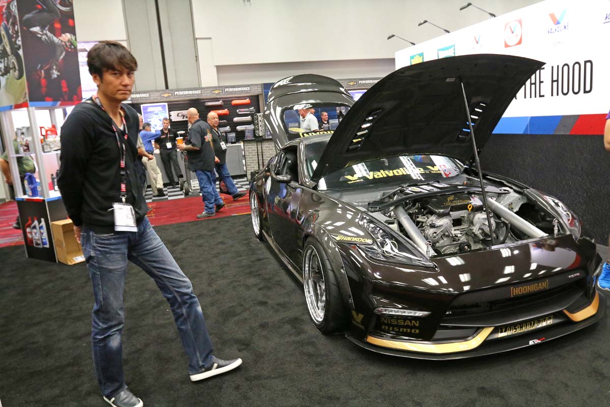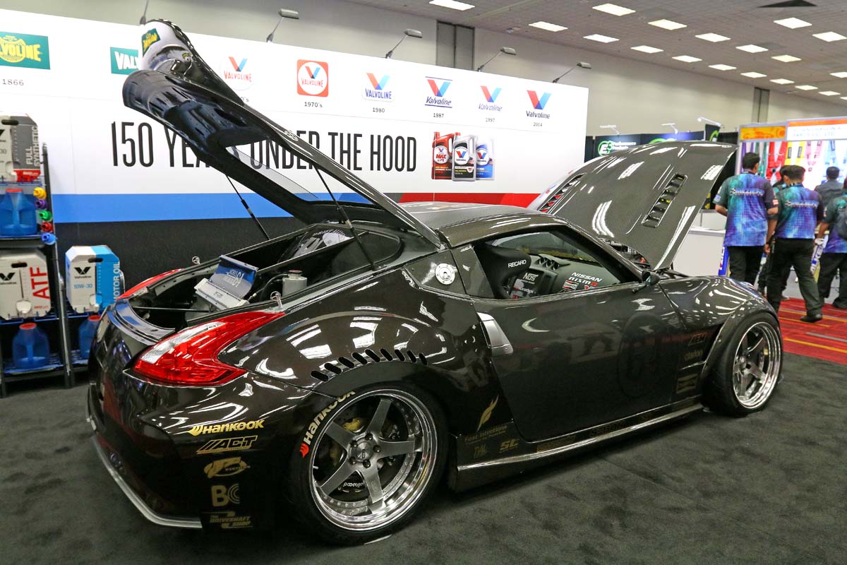 而展場這輛370Z其實是用來參加Formula DRIFT的工廠賽車,原廠引擎已透過鍛造腹內施以強化,並且將排氣量提升至4.0升,搭配Fast Intentions Stage.3的雙渦輪套件,這組套件與Stage.2最大不同就在於採用進78mm/排64mm,出風量更高的HTZ-3579銅套渦輪機本體,並且噴油嘴則是採用6支2000c.c.規格,搭配340L高流量汽油泵浦,最後串聯則並非是日系或是歐系高階可程式電腦,而是由美國AEM系統,E98酒精汽油搭配高達1.7bar的增壓條件下,最大動力已經上看1007hp之譜。