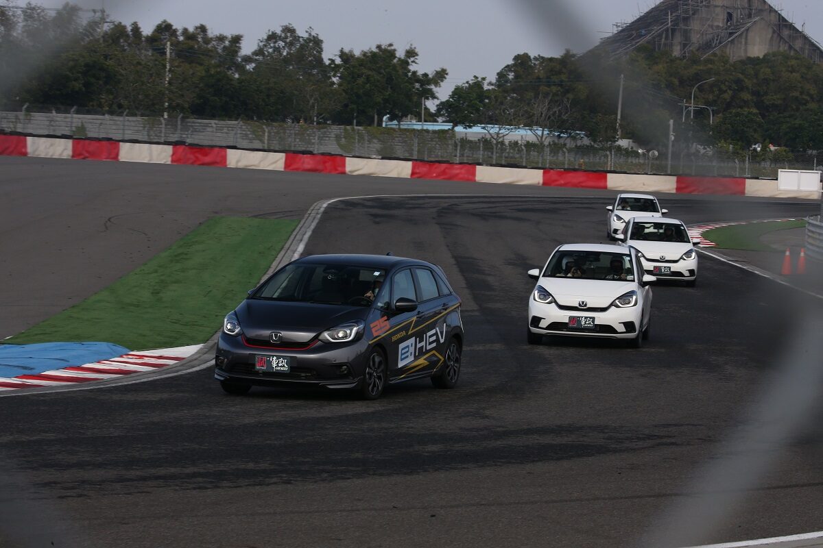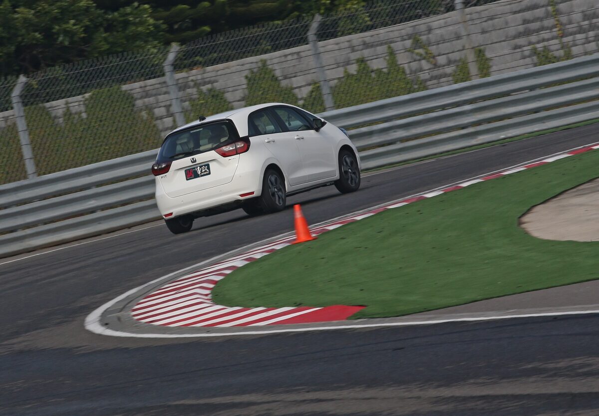 最後下賽道直接進行嚴苛的考驗,雖然對於此車那強調節能訴求的動力輸出以及舒適軟調的懸吊設定並不怎麼特別期待,但實際跑了幾圈之後卻發現其在賽道中的操駕表現比想像中的好且有趣,俐落明快的車頭轉向能力加上緊湊的車身以及穩定的車尾與良好的輪胎循跡性,還是能在賽道中將車子開得順暢又穩當,即便偏軟的懸吊在每次入彎後都會有不小的側傾,但車身底盤紮實度夠、懸吊的支撐性也還可以,同時把握好進彎前的煞車點,並且不要過度粗魯地扯動方向盤,即便這是部講求節能的掀背小車,依然能讓人在賽道中穩穩地享受奔馳賽道的樂趣,尤其還能在將近1公里的大直線段,全油門將車速拉升上130km/h,然後收油門踩煞車、再放煞車滑行入彎再補油門出彎,一氣呵成讓人大呼過癮,原來Fit e:HEV除了節能外,動態身手更是俐落不凡。