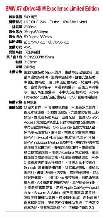 BMW X7 xDrive40i M Excellence Limited Edition 規格表