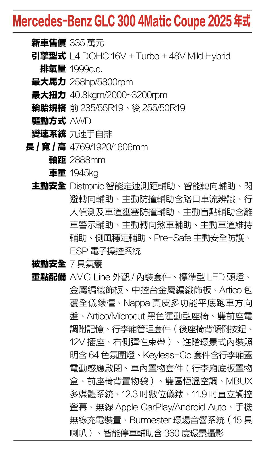 在動力配置上,新年式GLC 300 4Matic Coupe同樣搭載原廠代號M254、最大輸出258hp/40.8kgm的2.0L直四汽油渦輪引擎,加上可額外提供23hp馬力輔助的第二代ISG 48V高效輕油電系統,在9G-Tronic九速手自排變速箱與4Matic四驅系統共同驅策下,能在6.3秒完成0~100km/h加速,並提供輕快飽滿的整體加速力道;底盤部分亦維持標配跑車化懸吊系統,具備柔順明快的初段吸震表現與充足均衡的車身側傾支撐,搭配4Matic四驅系統提供的良好循跡性,無論高速巡航或山路過彎都能給人相當充足的操駕信心。