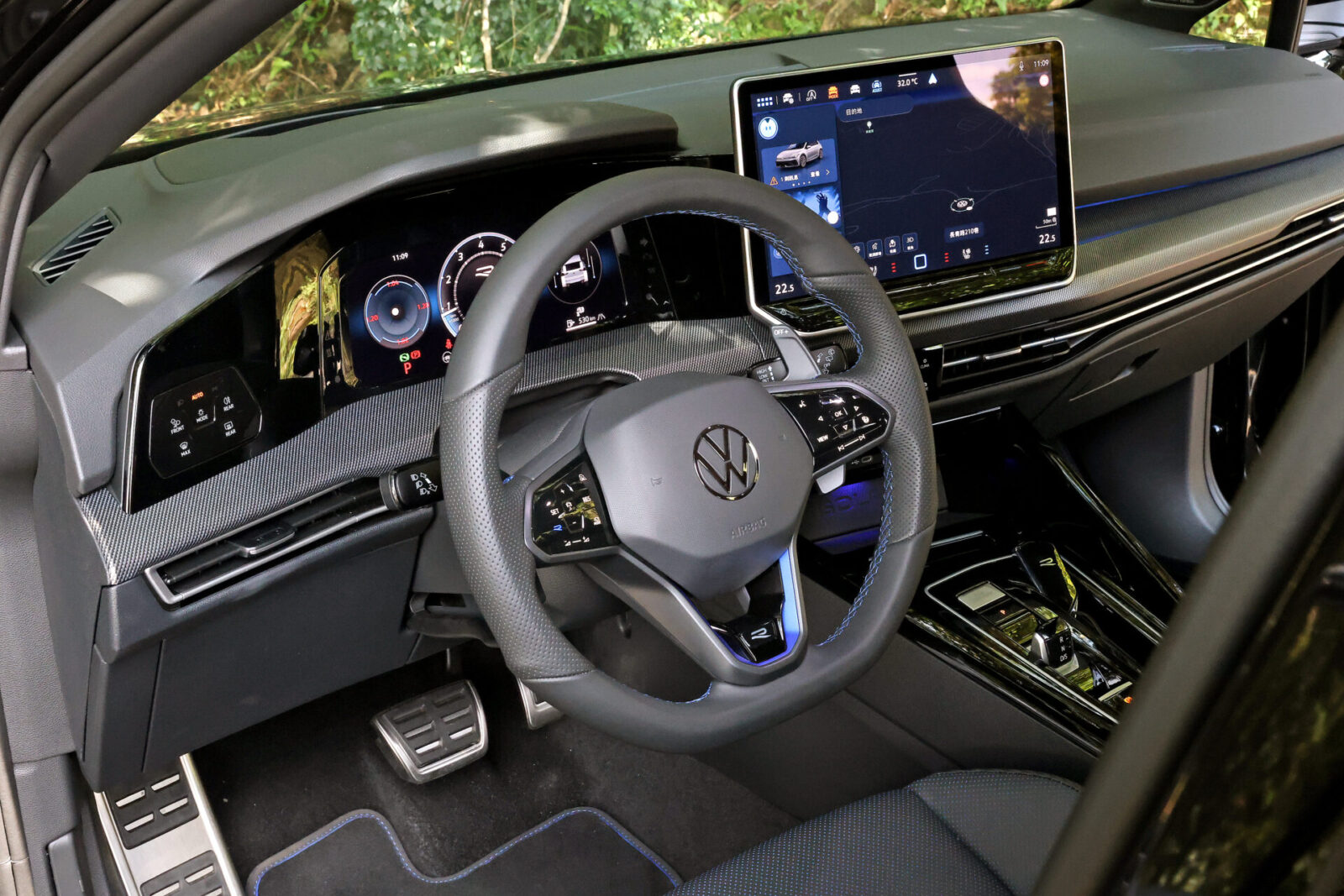 內裝方面跟隨小改款車系腳步,將過往與儀錶相連的一體式10吋觸控螢幕,改由懸浮式獨立造型的12.9吋MIB 4觸控多媒體系統取代,簡單明瞭的大型圖像化介面搭配應答活潑的中文智慧語音助理,讓小改款Golf R在熱血激情之餘更多了幾分科技與實用,只可惜順應消費者要求將方向盤快捷鍵改回實體配置的另一項變更並未延續至本車之上,仍然維持左下角可快速切換R模式的平面化觸控設計,激烈操駕時容易誤觸且不利於行進間快速盲操等小毛病依舊難以避免。