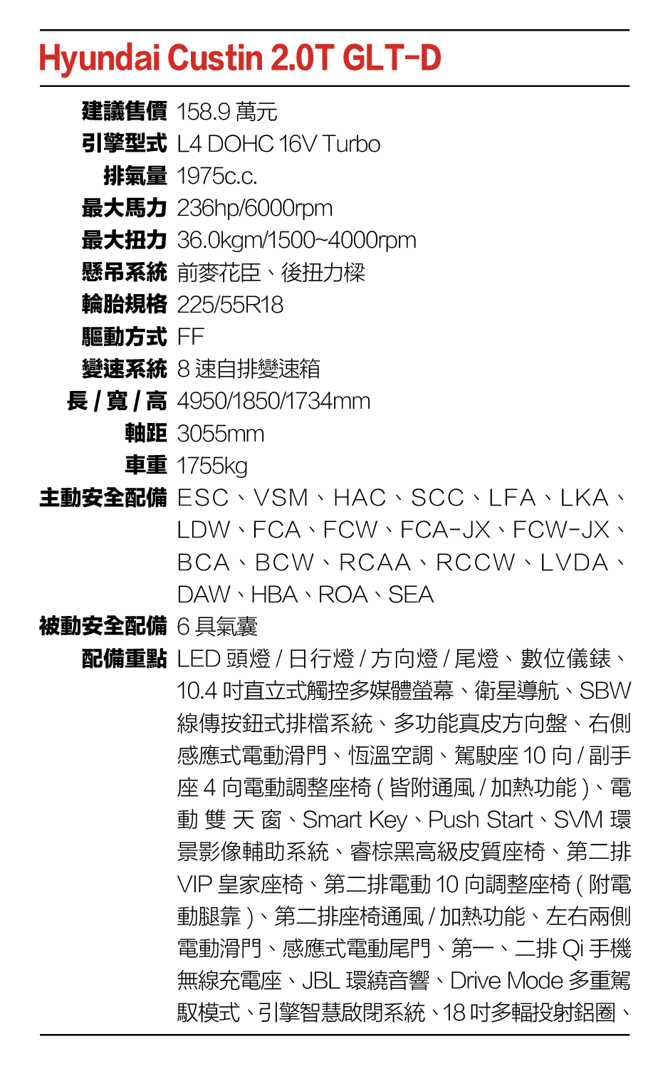 在擁有堪稱破錶高CP值的產品戰力下,Hyundai Custin這部7人座旗艦家旅,自2022年11月導入國內販售至今,可說創下了相當亮眼的銷售佳績。而如今南陽實業於9月初再度追加引進了搭載2.0升渦輪引擎的Custin 2.0T車型,並劃分為GLT-C及GLT-D兩種販售編成,新車價格分別為155.9萬與158.9萬元,與既有銷售的GLT-A與GLT-B兩款1.5升渦輪車型,形成更豐富的銷售陣容,為消費者帶來更多元的購車選擇。