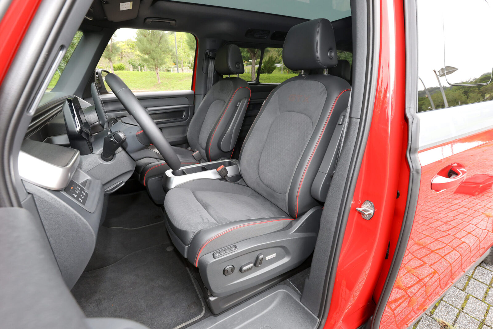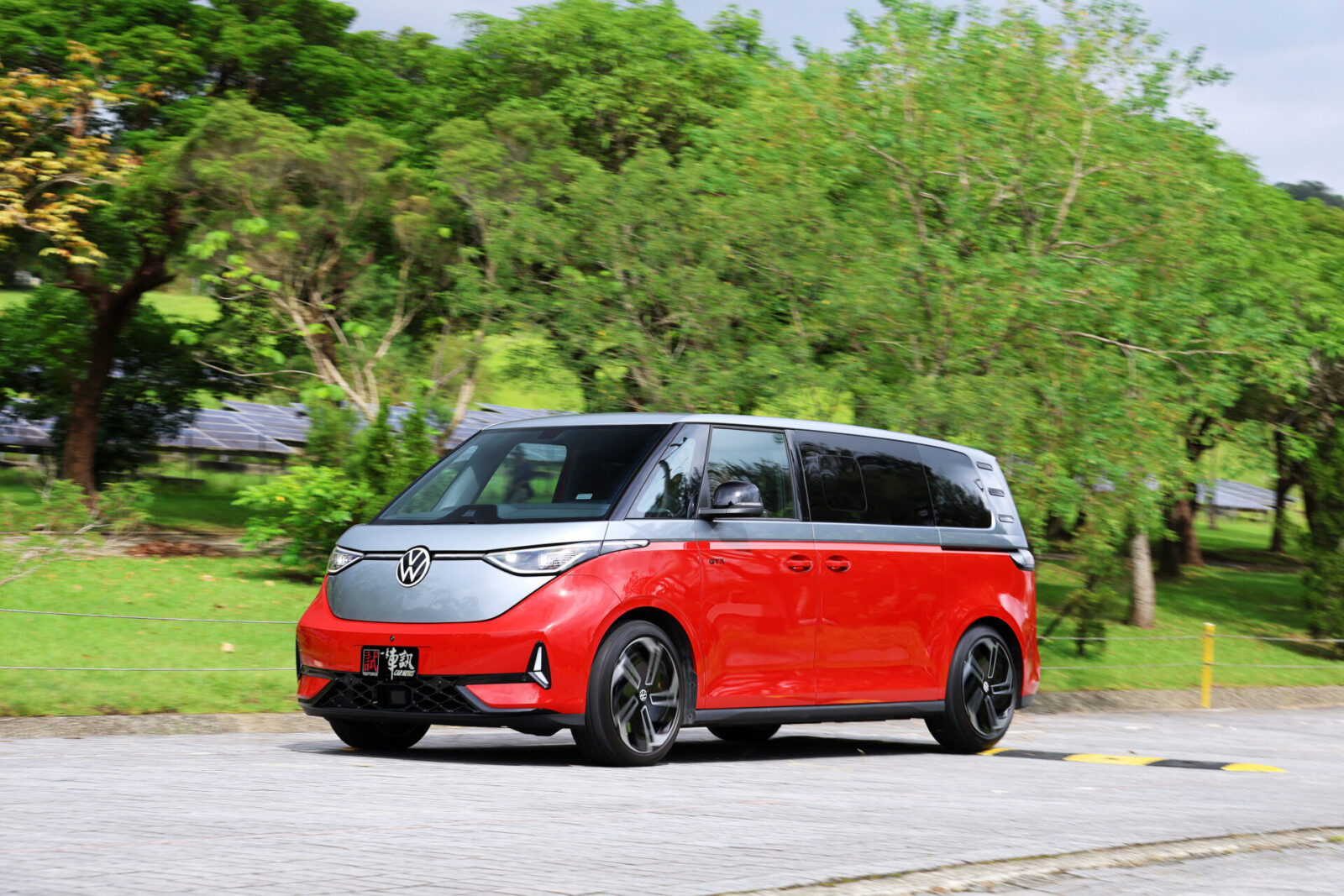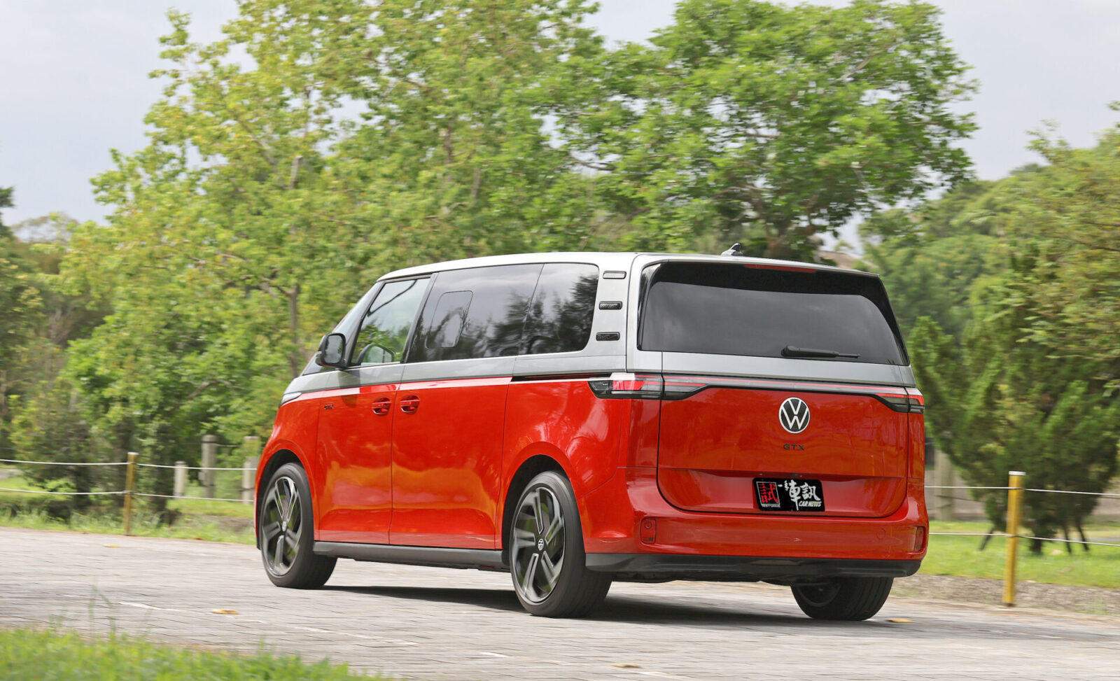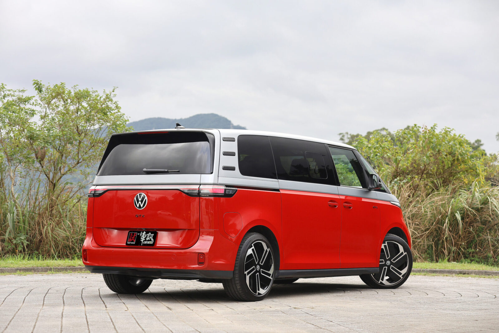 圓潤流線的車頭V型弧線配合碩大的福斯Logo廠徽,讓人一眼便能認出ID. Buzz傳承自經典T1的設計元素,而GTX車型為了進一步強調運動氣息,在前保桿部分採用更加方正銳利的折線,搭配兩側箭矢型的LED行車燈與中央菱形網格進氣壩造型,車側部分則可看到前車門追加的GTX字樣與21吋鑽石切割五輻雙色輪圈,較為可惜的是車尾除了大型廠徽底下的車型字樣改為GTX之外便沒有專屬元素,僅能從試駕車選用的櫻桃紅/極光銀雙色車身塗裝來辨認其獨特身份。