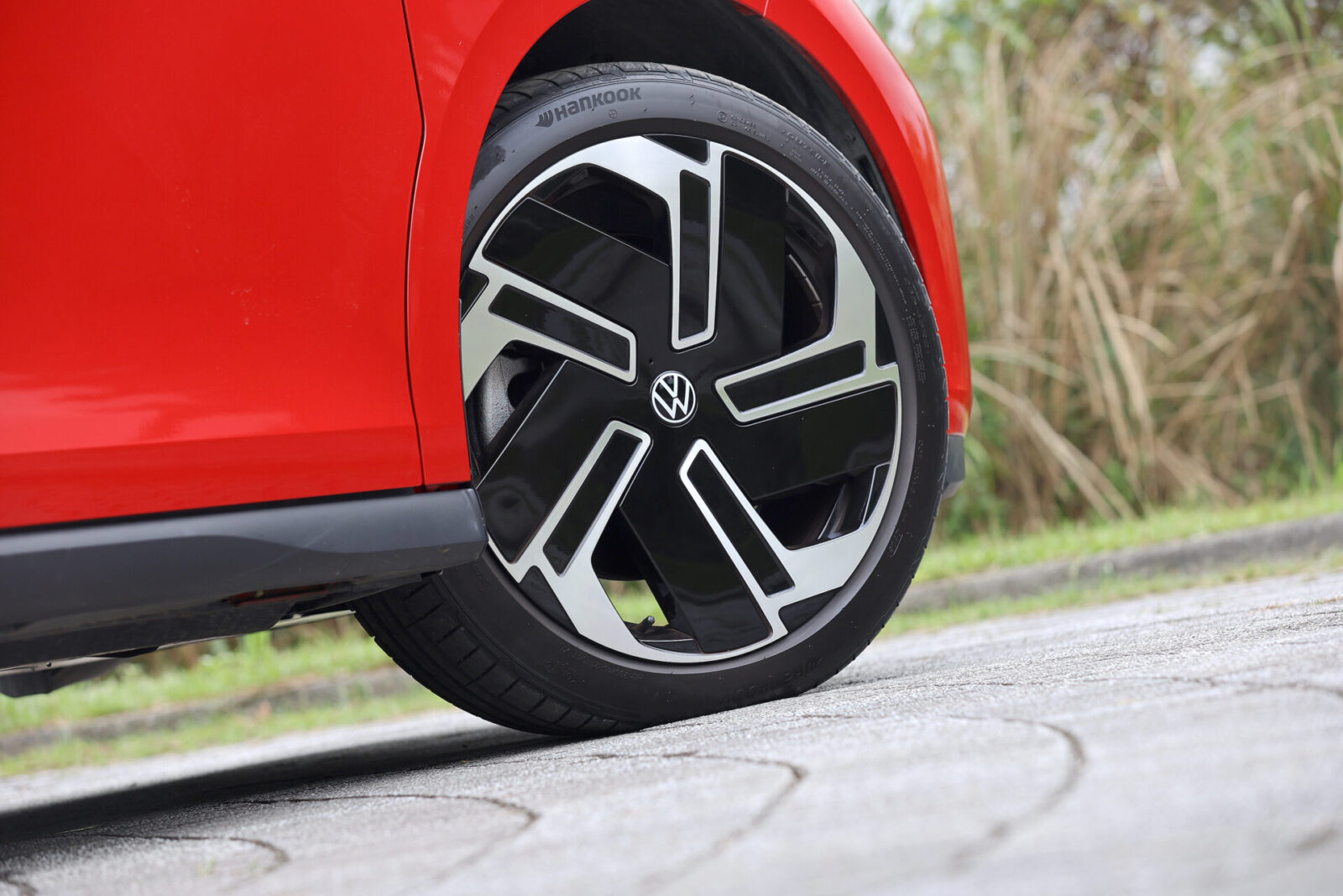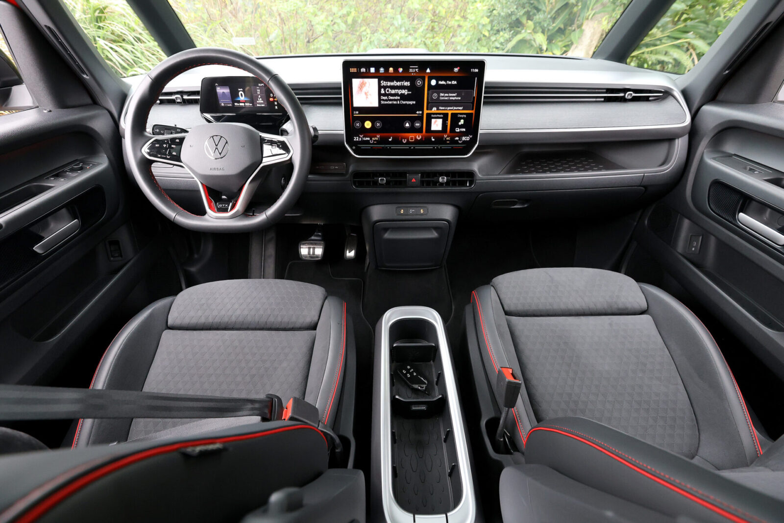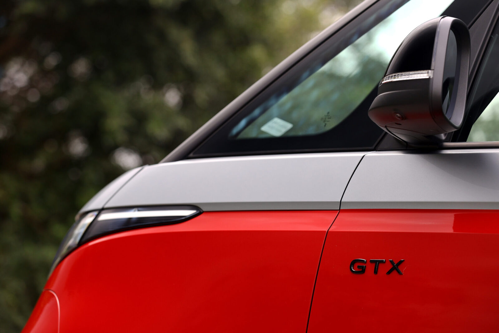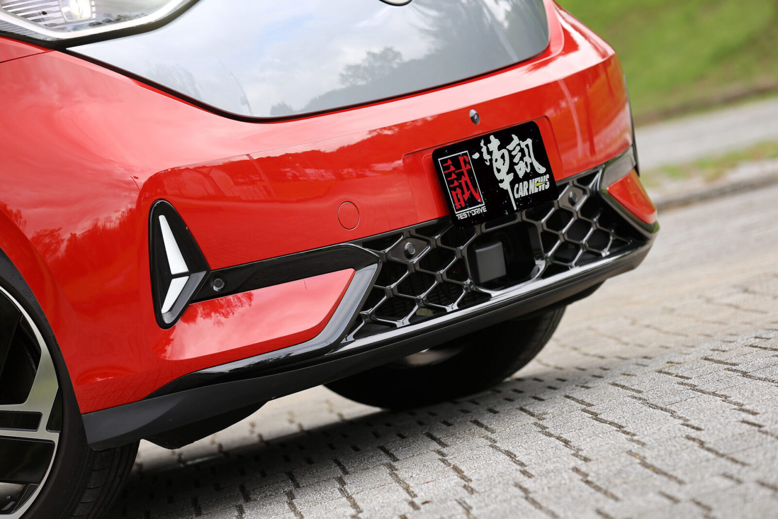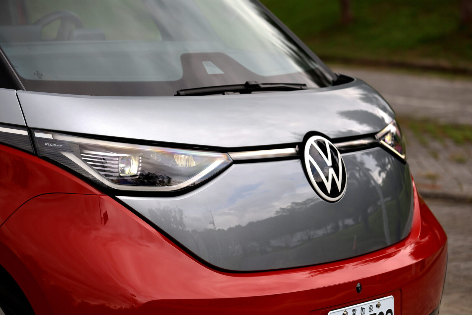 圓潤流線的車頭V型弧線配合碩大的福斯Logo廠徽,讓人一眼便能認出ID. Buzz傳承自經典T1的設計元素,而GTX車型為了進一步強調運動氣息,在前保桿部分採用更加方正銳利的折線,搭配兩側箭矢型的LED行車燈與中央菱形網格進氣壩造型,車側部分則可看到前車門追加的GTX字樣與21吋鑽石切割五輻雙色輪圈,較為可惜的是車尾除了大型廠徽底下的車型字樣改為GTX之外便沒有專屬元素,僅能從試駕車選用的櫻桃紅/極光銀雙色車身塗裝來辨認其獨特身份。