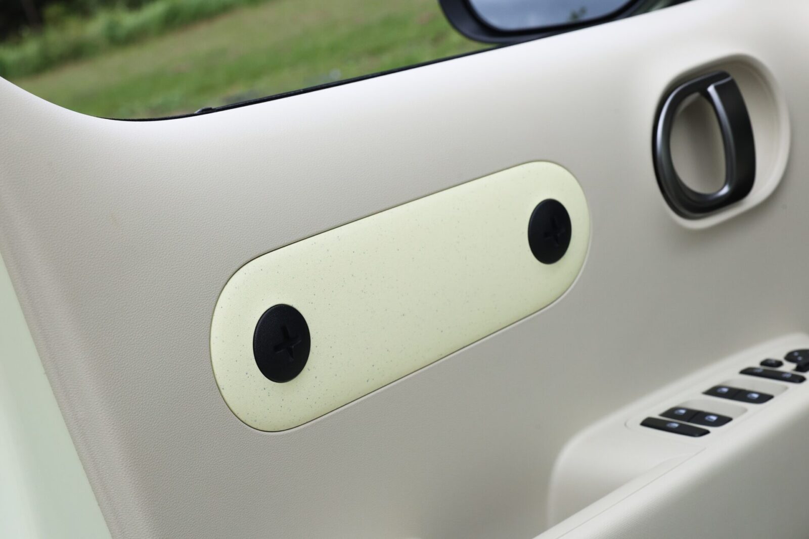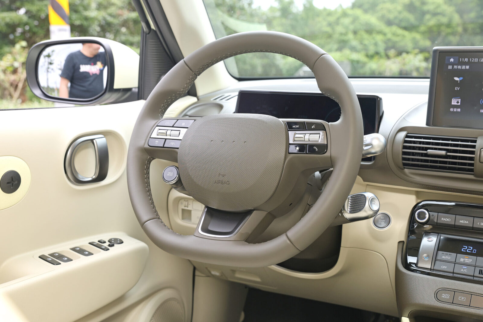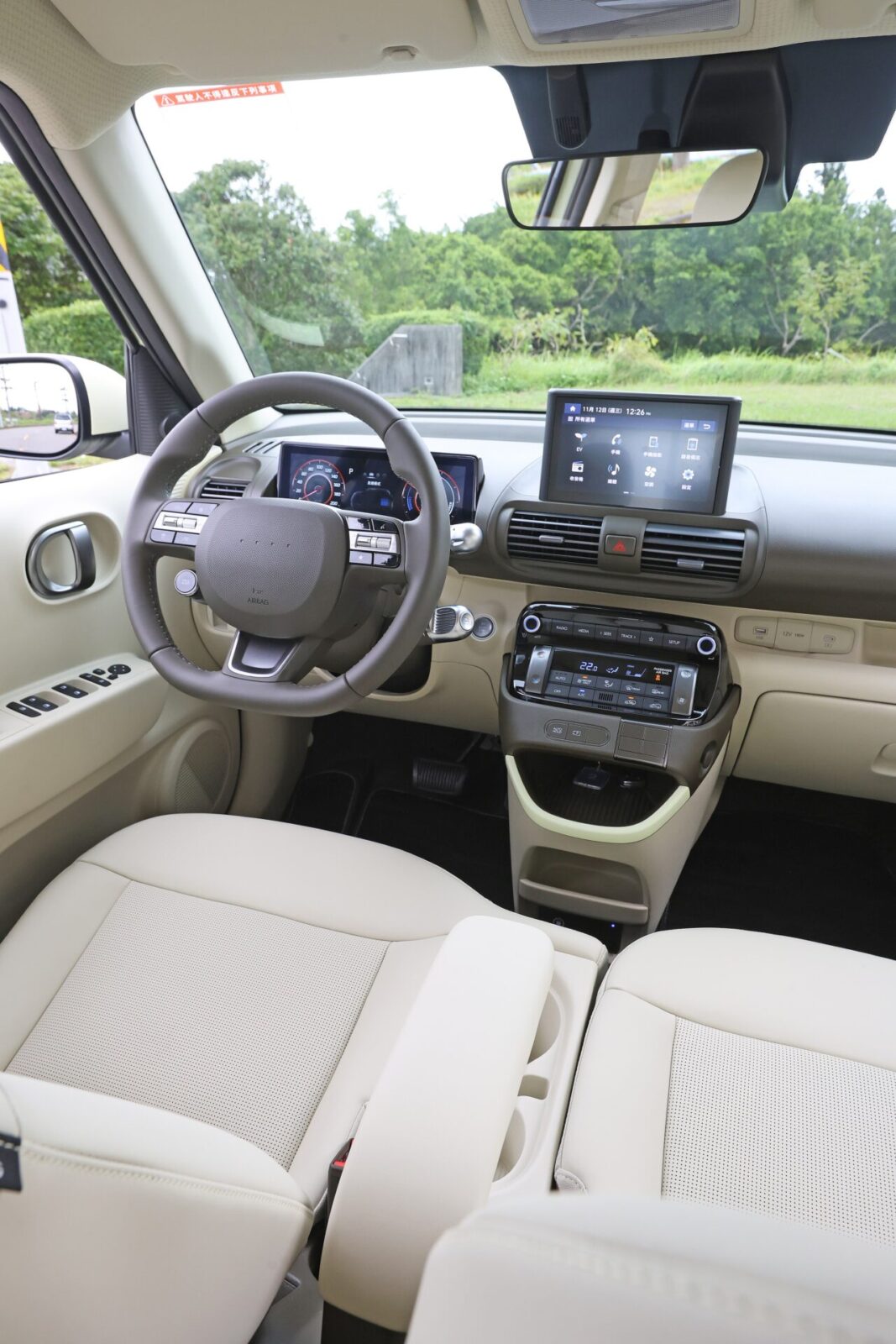 相較於令人十分驚艷且吸睛的外觀,Inster的內裝設計則顯得較為中規中矩,不過整體的鋪陳格局還是流露出些許可愛活潑的氣息,尤其這此試駕車款採鵝黃珍珠車色塗裝,並搭配米棕雙色內裝組合,包括車門、扶手、座椅以及控台下半部等都以淺色調的米色為主,配上控台上半層的棕色塗裝,而形成鮮明的對比色組合,著實為車艙內的活潑氣氛再加分。除此之外,長條橢圓造型的鵝黃色車門飾板,不僅可愛更採可替換式配件設計,讓車主可依喜愛自行更換網狀、透明或可插入卡片的卡夾款式等,來彰顯專屬的個性魅力。