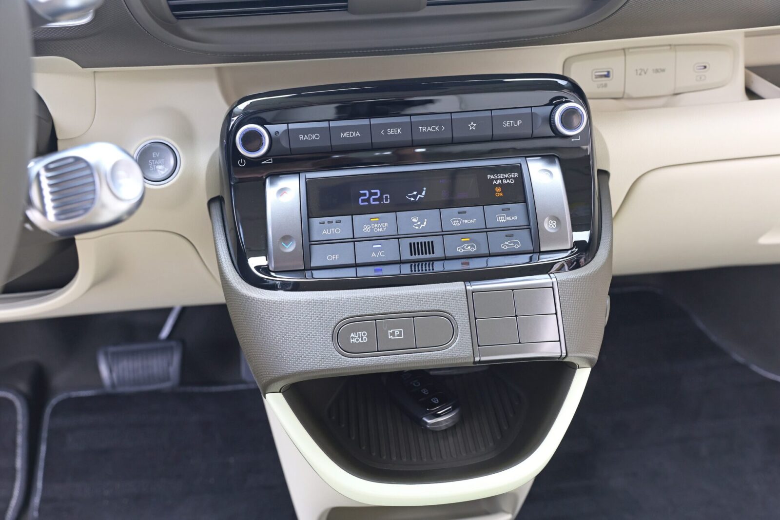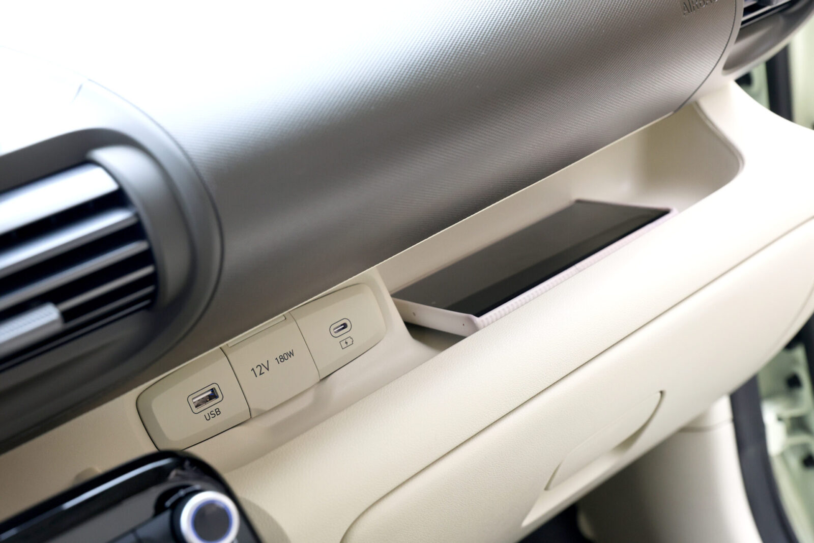 在配備上,雖然Inster在家族產品線中是屬於入門的微型電動掀背車作品,但仍擁有相當高規格的配備陣容,諸如10.25吋數位儀錶、8吋多媒體螢幕(無線Apple CarPlay/無線Android Auto)、三輻式多功能方向盤、SBW旋鈕排檔系統、多重駕馭模式、三段式動能再生制動系統、單踏板模式、恆溫空調、倒車顯影系統以及ESP+Auto Hold系統等皆為全車系標配,EV400-B以上車型更有V2L車內供電系統,唯一較可惜的是缺少了QI手機無線充電裝置吧。不過在車艙內卻有不少貼心的收納空間設計,首先手套箱上方的凹槽可擺放手機、錢包等小物品,左側邊更設計有USB、Type-C與12V充電插座;其次,中島鞍座也規劃有雙層式收納凹槽,且右側亦有圓形掛勾配置,甚至副手座車門扶手前端還擁有隱藏式掛勾等巧思設計。